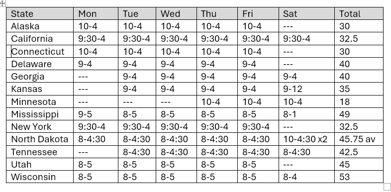 The chart below is a sampling of hours that U.S. state archives are open for research each week. Many require appointments and don’t forget to double check the hours before a visit. Thoroughly browse through the website of any you plan to visit or to contact otherwise to learn more about the gems each holds. A growing number have catalogs, inventories, indexes and digitized records on their website. Some post a variety of records on state memory or encyclopedia projects. Check the major genealogy websites for some indexes and records from state archives.