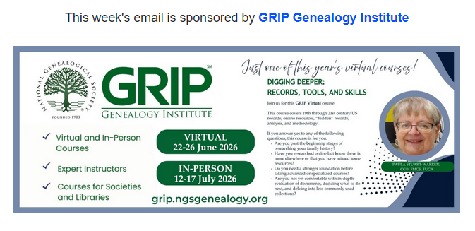 Do you know about https://conferencekeeper.org/? A great website to learn about genealogy events, both in-person and online. Tami does an excellent job with the website and with the weekly email update. Sign up for that at the URL at the top of this post. I was scrolling down today’s email and suddenly stopped when I recognized the person in this ad. Yes that’s me and the title of the GRIP Genealogy Institute course I coordinate and teach along with several fantastic instructors. Please join us in June for a week of virtual learning, interaction, a bit of fun, and delving into more records and more records. An extensive syllabus/workbook is being put together for our students and will be shared a week before the week of June 22d. Learn more about the course in general and about each session during the week at https://grip.ngsgenealogy.org/courses/digging-deeper-records-tools-and-skills/ If you sign up soon, you will be eligible to send me a U.S. research problem of your own and have it discussed during the week with amazing suggestions provided.