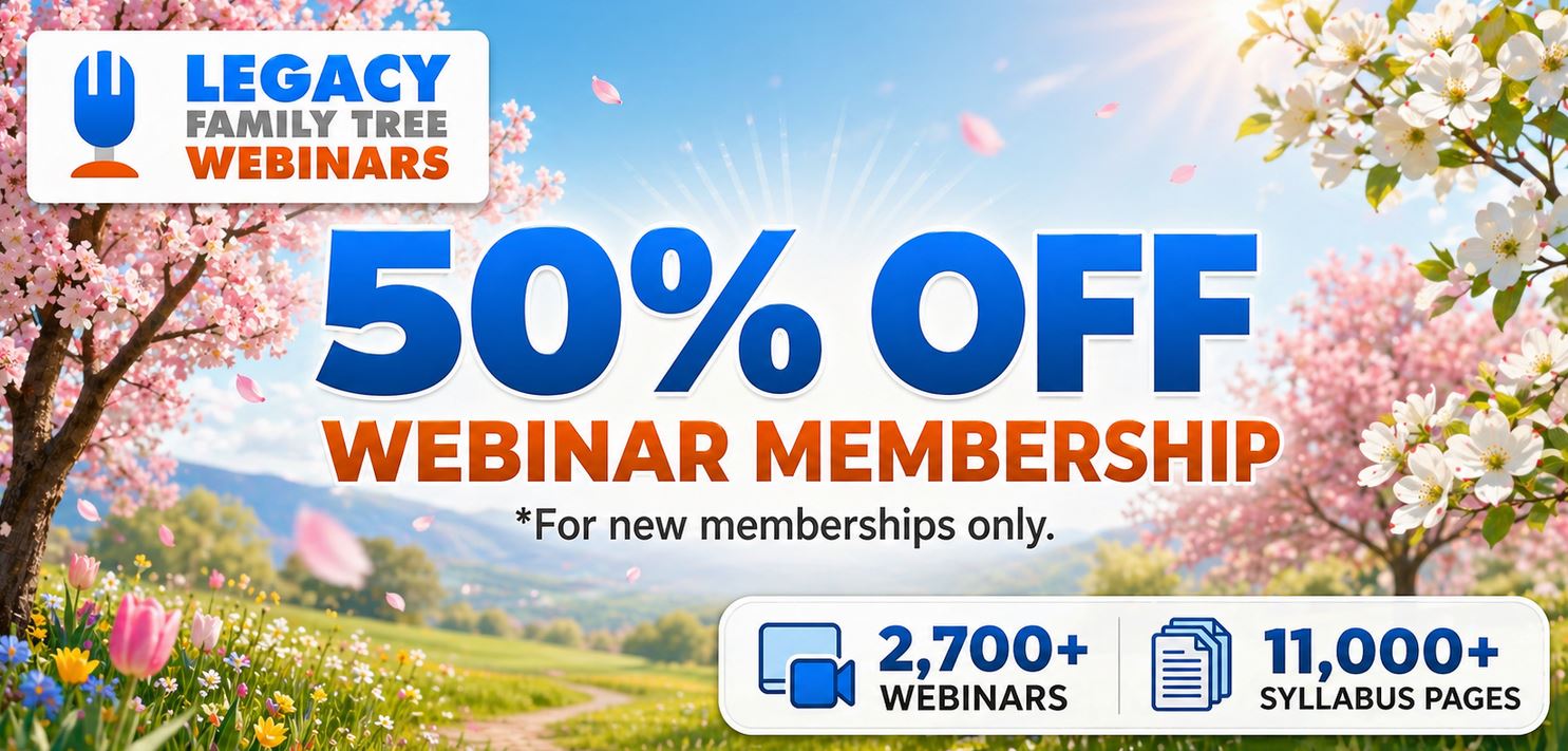 While you are taking advantage of this special offer, don’t miss signing up for my webinar presentation this Friday afternoon. https://familytreewebinars.com/upcoming-webinars?ref=566036